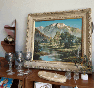 favorite pieces tend to rotate, but at the moment it is an oil painting by Masao Kinoshita, a beautifully framed mountain landscape in an old carved wooden frame. The artist has a rich and fascinating background—one Maria recommends you read about if you appreciate art and history.